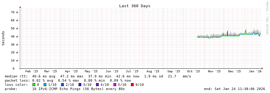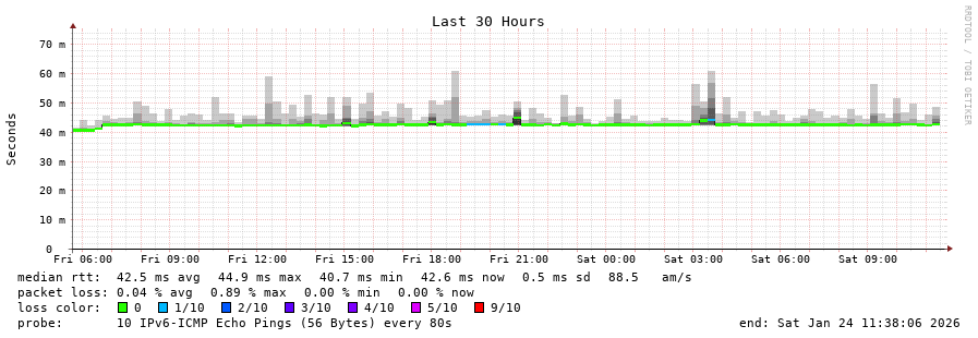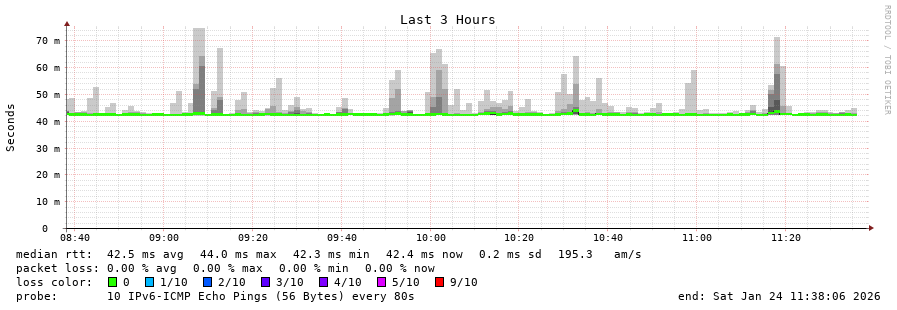 traceroute to 2001:67c:1e0:0:c225:e9ff:fea8:6a0a (2001:67c:1e0:0:c225:e9ff:fea8:6a0a), 30 hops max, 80 byte packets - Generated at 2026-01-24 11:30:01