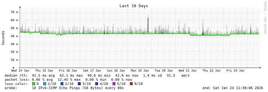 17 > 2001:67c:1e0:0:c225:e9ff:fea8:6a0a (2001:67c:1e0:0:c225:e9ff:fea8:6a0a) [AS31554] 42.539ms 42.651ms 42.383ms